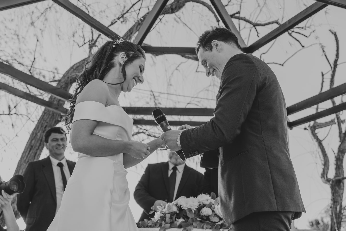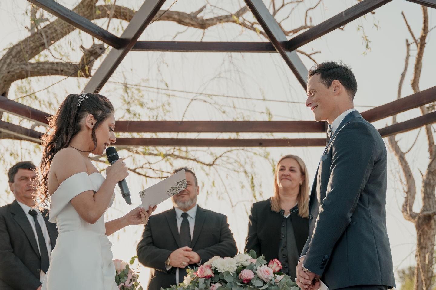 Una boda romántica al atardecer en un entorno rodeado de viñedos. Los rayos dorados del sol poniente iluminaban la escena, mientras la pareja se unía en un altar adornado con flores y enredaderas. El aroma de las uvas maduras flotaba en el aire, y el paisaje de viñedos verdes se extendía hasta el horizonte, creando un ambiente íntimo y mágico. Los invitados, rodeados de naturaleza, compartieron una velada llena de amor y serenidad, bajo un cielo que se teñía de tonos rosados y dorados.